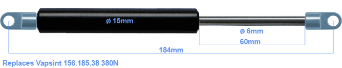 The bore of the house of this replacement gas spring is 15 mm. The diameter of the rod totals 6 mm. The stroke (the retracting part) has a length of 60 mm. The total length of this gas strut is 184 mm. Keep in mind that this is the length between the centers of the mounting parts. The length from thread to thread (wihout mounting parts) is 152 mm. This gas spring (156.185.38) has a force of 380 Newton. This gas spring can replace a Vapsint gas spring, but is not an orignal Vapsint one. This gas spring was produced by Stabilus subsidiary HAHN. The force (380 N) and dimensions are identical to the original.