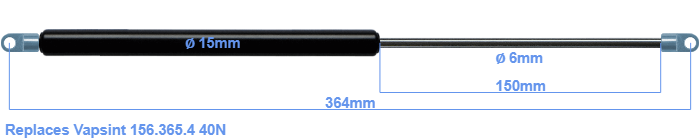 The bore of the house of this replacement gas spring is 15 mm. The rod has a diameter of 6 mm. The rod (the chrome part) is 150 mm long. The total length of this replacement is exactly 364 mm. This is the total distance between the centers of the two mounting parts. The distance from thread to thread (without mounting parts) is 332 mm. The force of this replacement gas spring is 40 Newton. This is not an original gas spring produced by Vapsint, but it can replace a Vapsint gas spring. This replacement gas spring is a HAHN gas spring. The force (40 N) and dimensions are identical to the original.